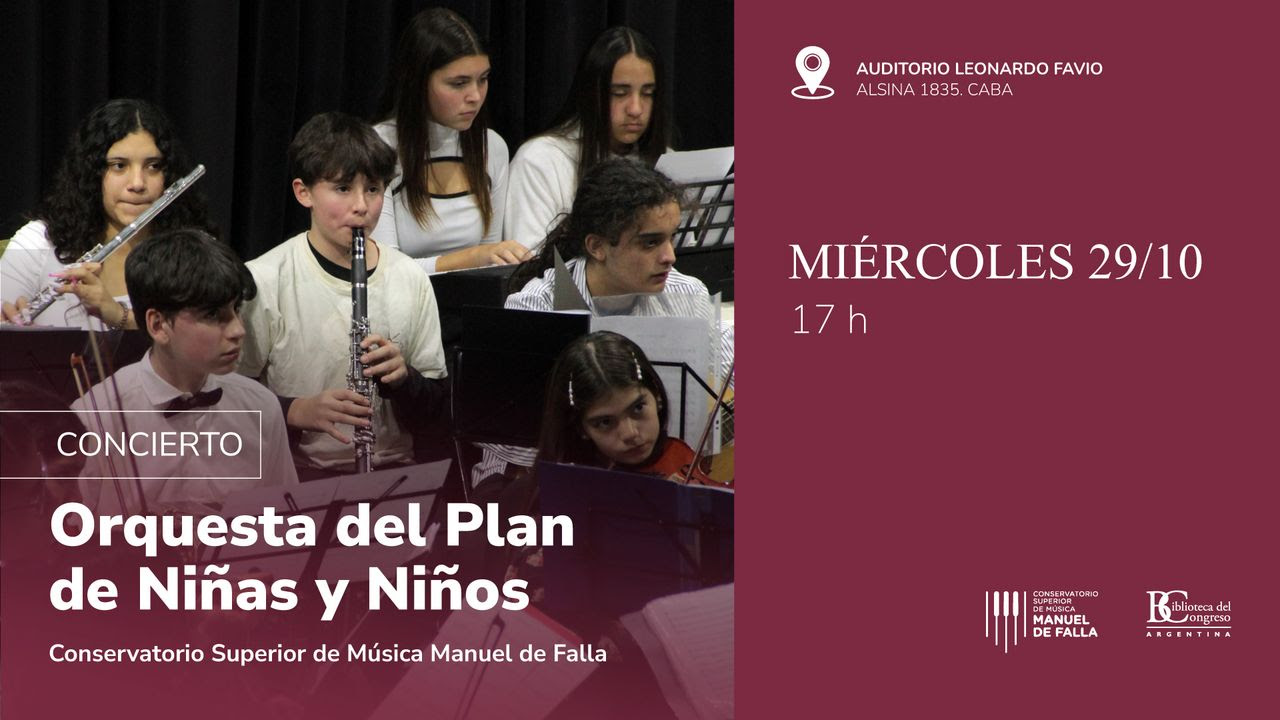 La Biblioteca del Congreso de la Nación invita a disfrutar de un concierto especial a cargo de la Orquesta del Plan de Niñas y Niños del Conservatorio Superior de Música Manuel de Falla, que se realizará el próximo miércoles 29 de octubre a las 17 horas en el Auditorio Leonardo Favio del Espacio Cultural (Alsina 1835, CABA), con entrada libre y gratuita.