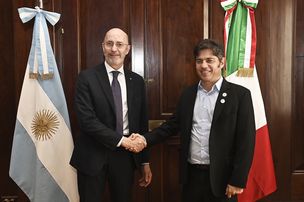 El gobernador de la provincia de Buenos Aires, Axel Kicillof, recibió este miércoles al embajador de Italia, Fabrizio Nicoletti, para impulsar la cooperación bilateral y potenciar las oportunidades conjuntas. Fue en el Salón de Acuerdos de la Gobernación, junto al ministro de Gobierno, Carlos Bianco, y el subsecretario de Relaciones Internacionales e Interjurisdiccionales, Juan Manuel Padín.