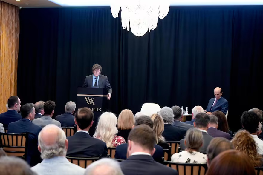 En el marco de su visita a Estados Unidos, el presidente Javier Milei encabezó una exposición ante más de 80 empresarios e inversores en un hotel de Beverly Hills, acompañado por el ministro de Economía, Luis Caputo, y el embajador argentino en EE.UU., Alec Oxenford. El evento fue organizado por el economista Michael Milken, quien también moderó el intercambio.