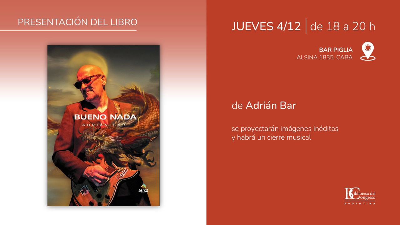 El jueves 4 de diciembre, a las 18 h, nuevamente en el Bar Piglia, se presentará Bueno Nada, de Adrián Bar, músico, compositor y pionero del rock nacional. El encuentro contará con la participación de destacadas figuras del espectáculo, la proyección de material inédito y un cierre musical. El libro propone un viaje por las ideas, vivencias y emociones del autor, atravesado por la creatividad, la enfermedad, la sensibilidad y las pasiones que marcaron su vida. Tal como señala Daniel Ripoll en la reseña, se trata de una obra que invita a ingresar en un universo personal donde la imaginación, las experiencias y la búsqueda de sentido convergen en un mensaje centrado en la positividad y el amor.