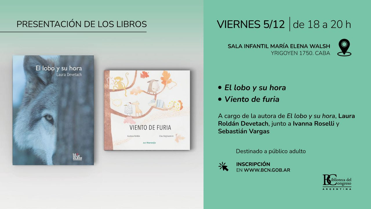 Finalmente, el viernes 5 de diciembre, a las 18 h, en Sala Infantil María Elena Walsh (H. Yrigoyen 1750, CABA) será la presentación de la nueva edición de Viento de furia, de Gustavo Roldán, ilustrado por Claudia Degliuomini y publicado por Ediciones Del Naranjo; y el nuevo poemario para adultos de Laura Devetach, El lobo y su hora, editado por La Gran Nilson editora. Será con la presencia de la autora y como invitada especial Ivanna Roselli, psicopedagoga, narradora oral y especialista en Literatura. El evento requiere inscripción previa.