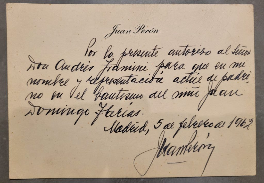 La historia de Juan José Farías Figueroa tiene un origen que parece sacado de una novela. Su padre, Ángel Farías, fue uno de los fotógrafos presidenciales de Juan Domingo Perón y mantenía un vínculo cercano con el líder justicialista. Tanto fue así, que Perón aceptó ser el padrino de su hijo y lo dejó asentado en una carta fechada en Madrid, en 1961, donde expresa el “gran placer en aceptarlo”.