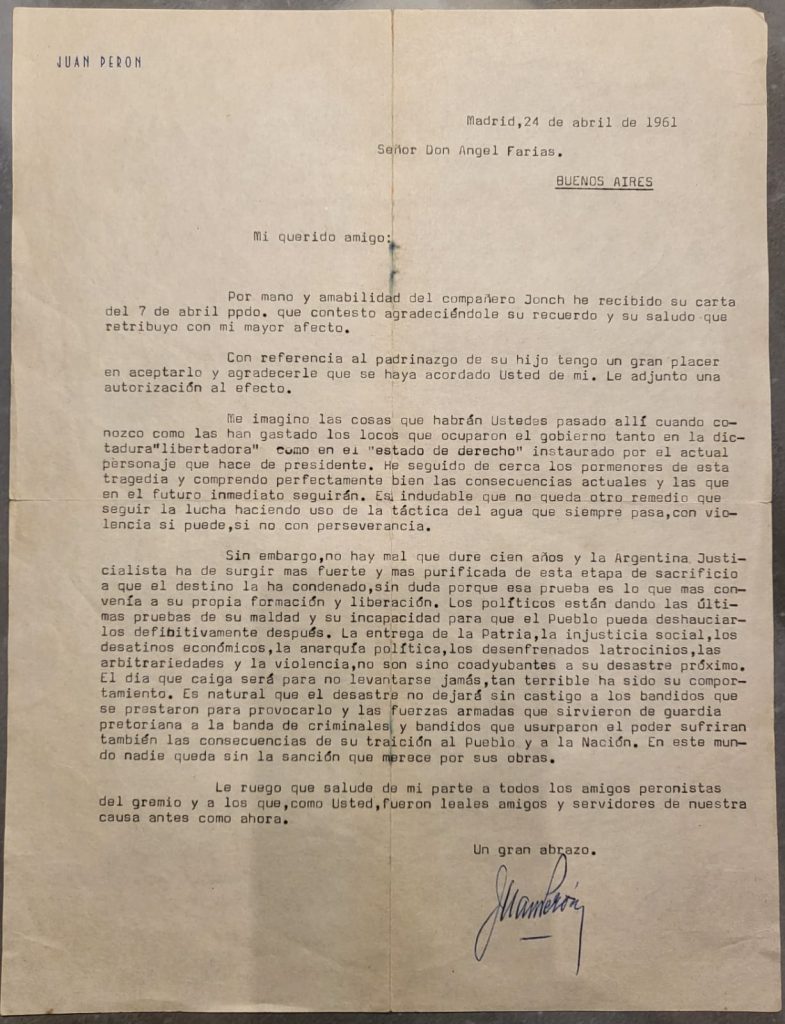 En una carta fechada en Madrid el 24 de abril de 1961, Juan Domingo Perón le escribía a Ángel Farías —fotógrafo presidencial y padre de Juan José Farías Figueroa— un análisis político que, más de sesenta años después, parece dialogar con la realidad argentina.